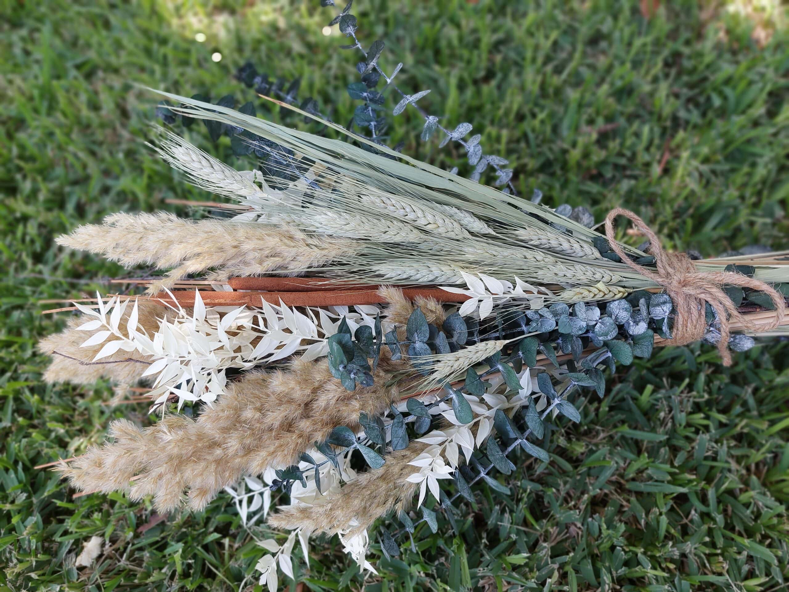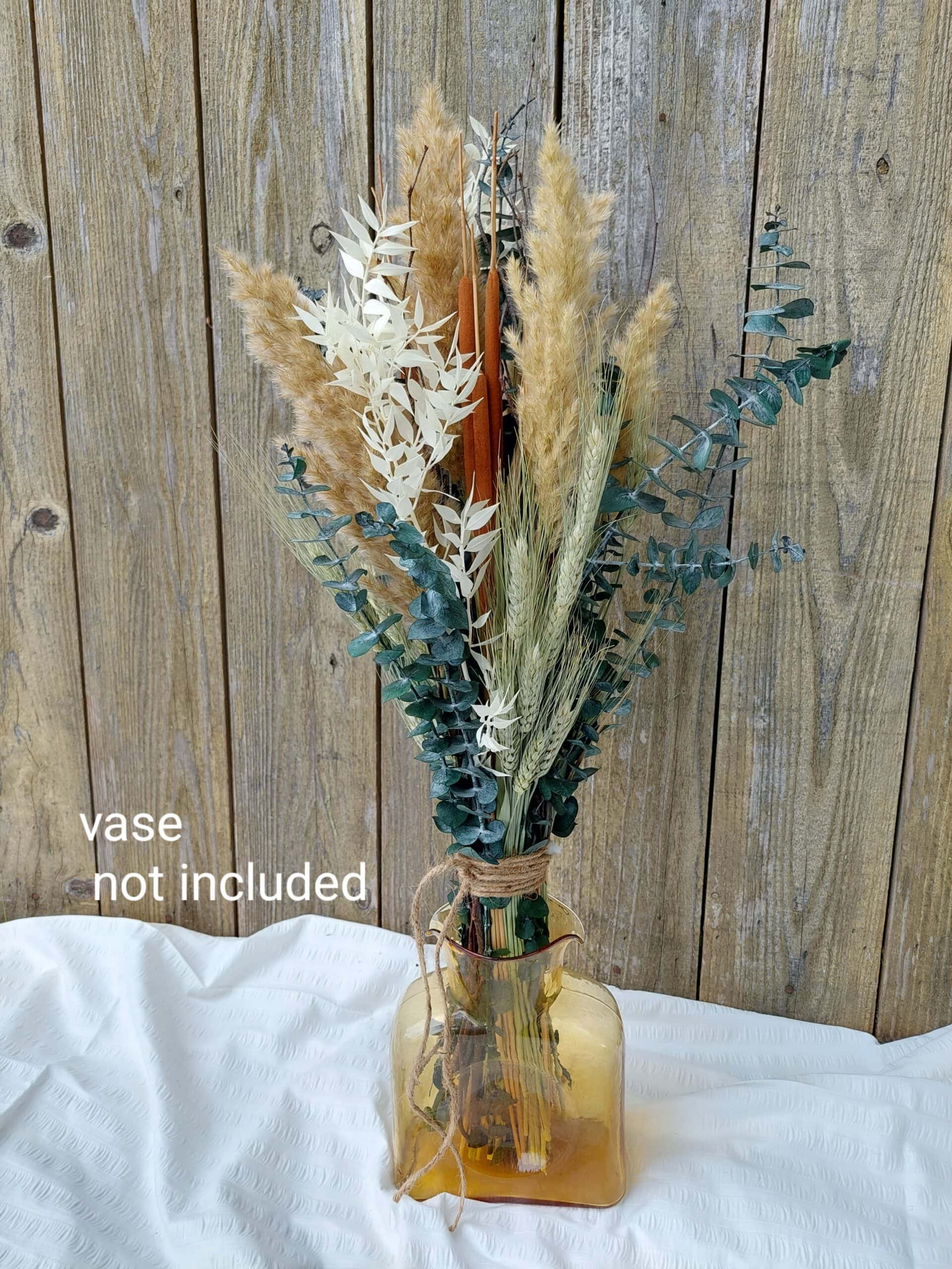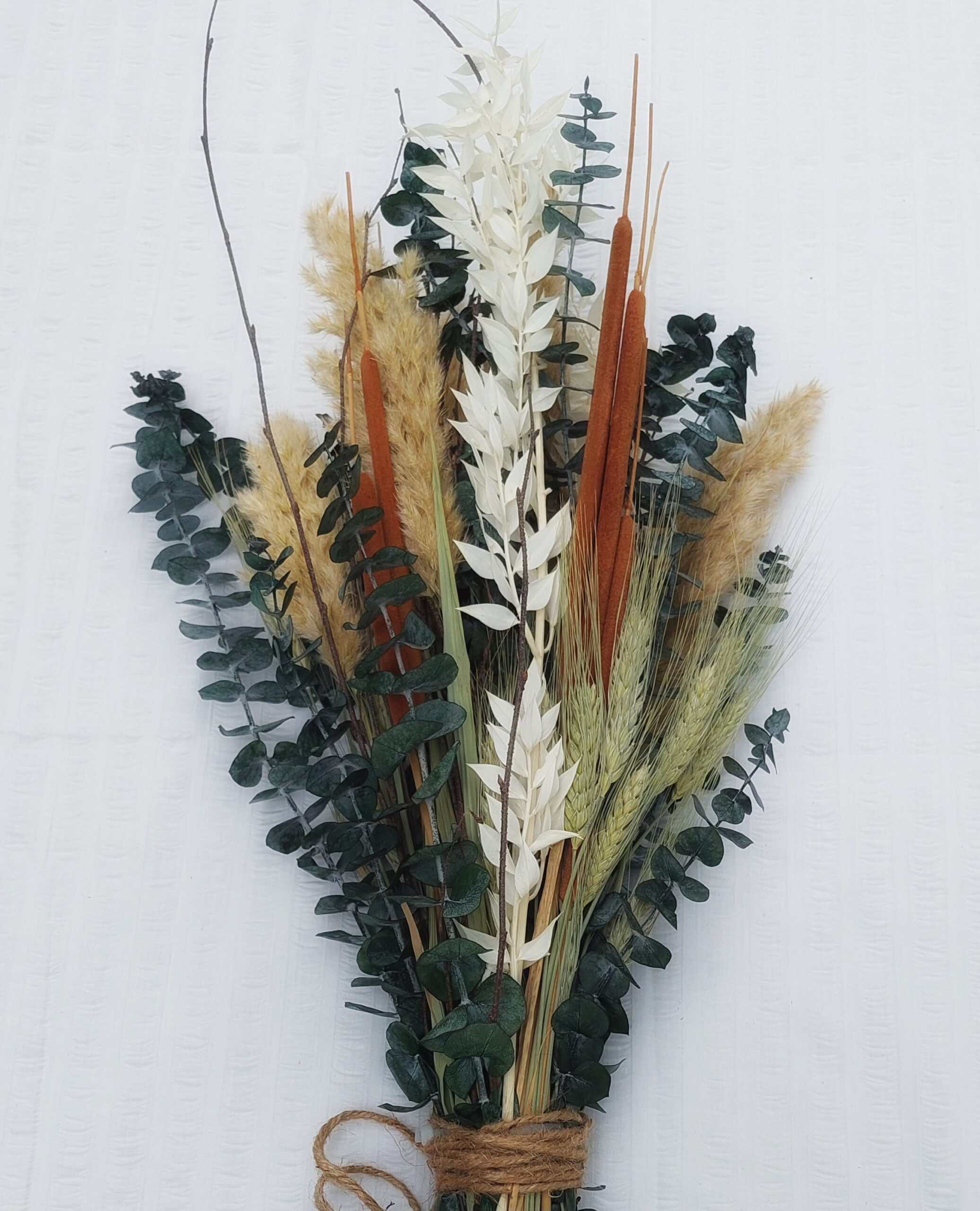 Add a natural flare to any table setting or room with a stylish dried flower bouquet! Preserved eucalyptus, mini cattails, green wheat, birch twigs, and wild mini pampas grass are gathered to create this beautiful rustic-style farmhouse bouquet. Each bouquet is handcrafted, carefully wrapped in natural brown kraft paper, and tied with jute. This bouquet is perfect on its own as a decorative piece or placed in your favorite vase.