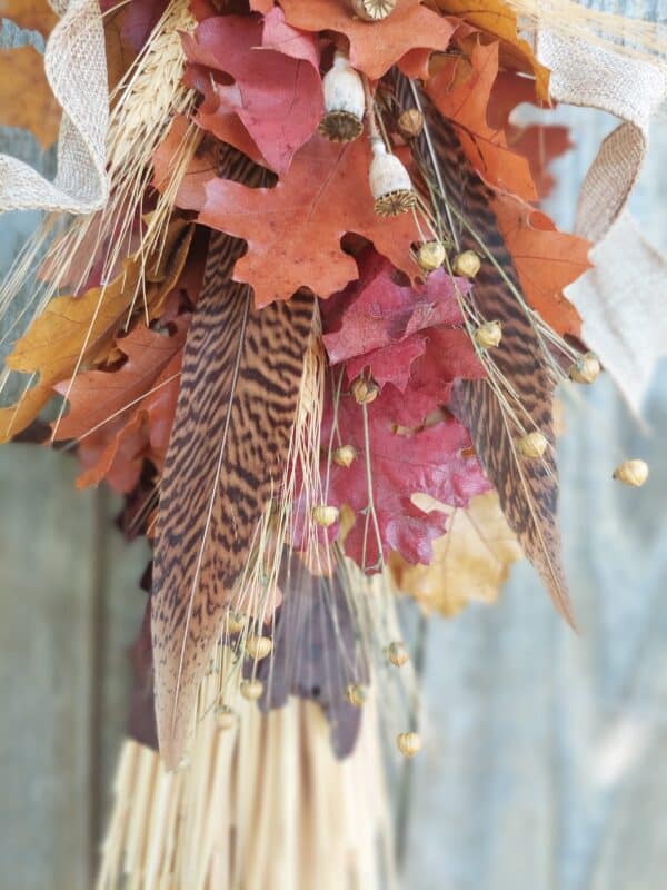 Fall Leaves Wheat Swag with pheasant feathers and burlap wired ribbon – Fall Home Decor